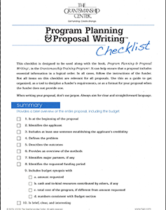 This checklist is excerpted from, and aligns perfectly with, our textbook, Grantsmanship: Program Planning & Proposal Writing. It gives you the essential points to consider for proposal writing (and while planning your program!). Presented as an easy-to-use, writable, PDF, you can use it again and again.