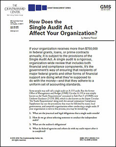 UPDATED Organizations that receive more than $750,000 in federal funds annually must undergo a rigorous financial and compliance review called a Single Audit. This 14-page article explains the practical and legal aspects of a Single Audit and provides a variety of resources to help your organization go into the process well-prepared.
